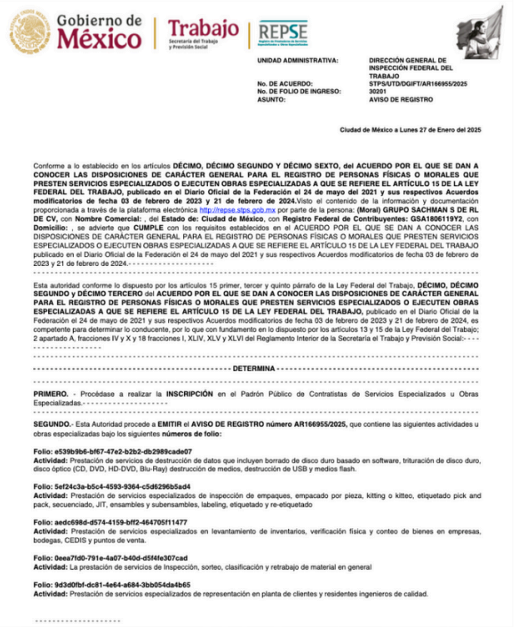 Contamos con registro oficial ante la STPS en el padrón REPSE, lo que nos autoriza legalmente para brindar servicios especializados conforme a la Ley Federal del Trabajo. Esto garantiza transparencia, cumplimiento normativo y confianza operativa ante cualquier auditoría o cliente corporativo.